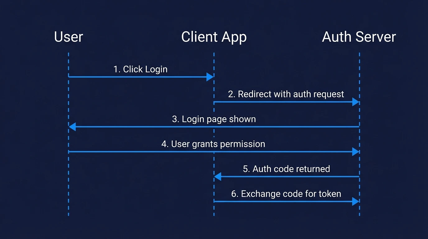The most common and secure OAuth 2.0 flow is the Authorization Code flow. Here's exactly what happens, step by step: