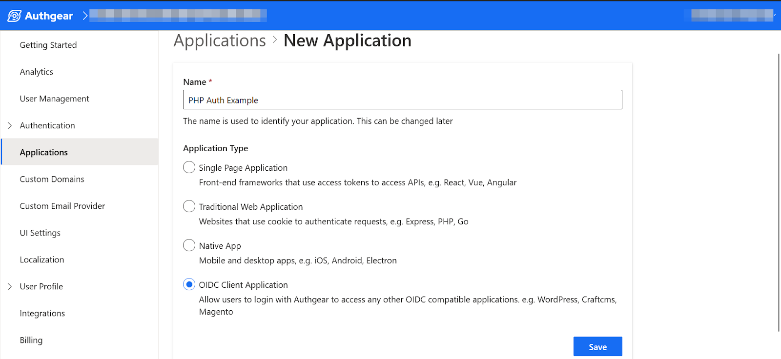 首先登入 Authgear 入口網站並建立新專案或選擇現有專案。然後,導航到專案的 Applications 部分。建立一個新的應用程序,類型為OIDC Client Application,如下所示: