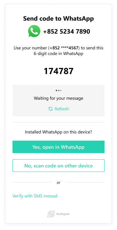 另一種更直接的用戶身份驗證方法是透過 WhatsApp。 WhatsApp OTP 與 SMS 驗證非常相似。然而,Authgear 的 WhatsApp OTP 機制與其他機制不同。