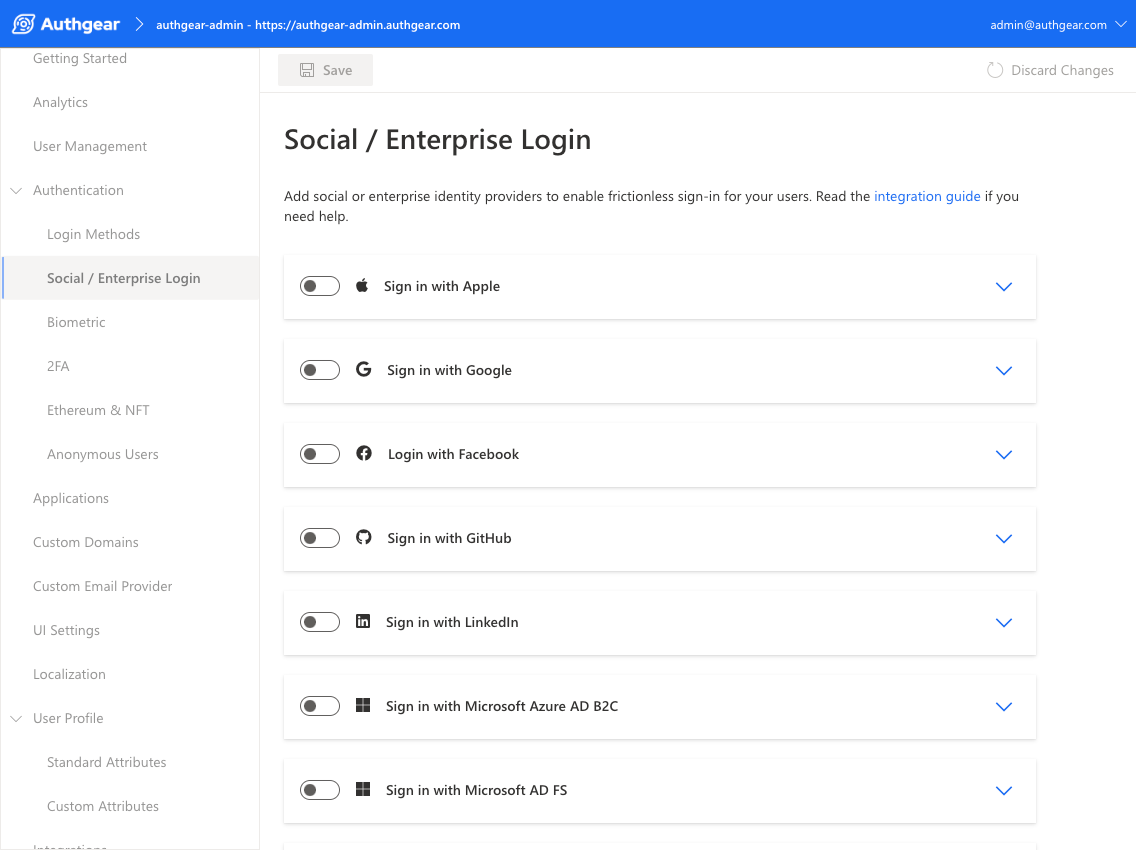 社群登入能幫企業取得更完整的客戶輪廓、減輕客服負擔,並提升參與度;但要在網站或 App 逐一串接不同供應商,確實耗時費力。讓 Authgear 分擔這些工程工作:完成整合後,你通常只要幾下點擊,就能啟用或關閉 Apple、Google、Facebook、LinkedIn 等常見社群登入。