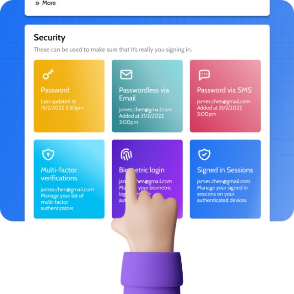 Empower your users to have more control over their credentials and activities with the pre-built account setting page. Customers can manage their identities, change their passwords, manage their authentication methods, set up 2FA, revoke signed in sessions, or even edit their profile information without having to contact the support team.