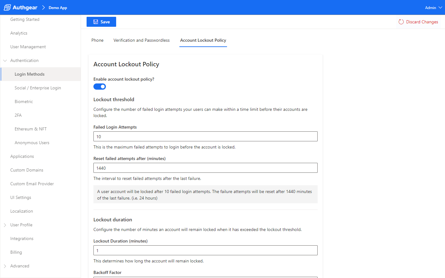 In addition to the threshold, you can also configure the lockdown duration, the backoff factor by which the lockout duration will be multiplied for every subsequent failed attempt, and a maximum lockout duration.