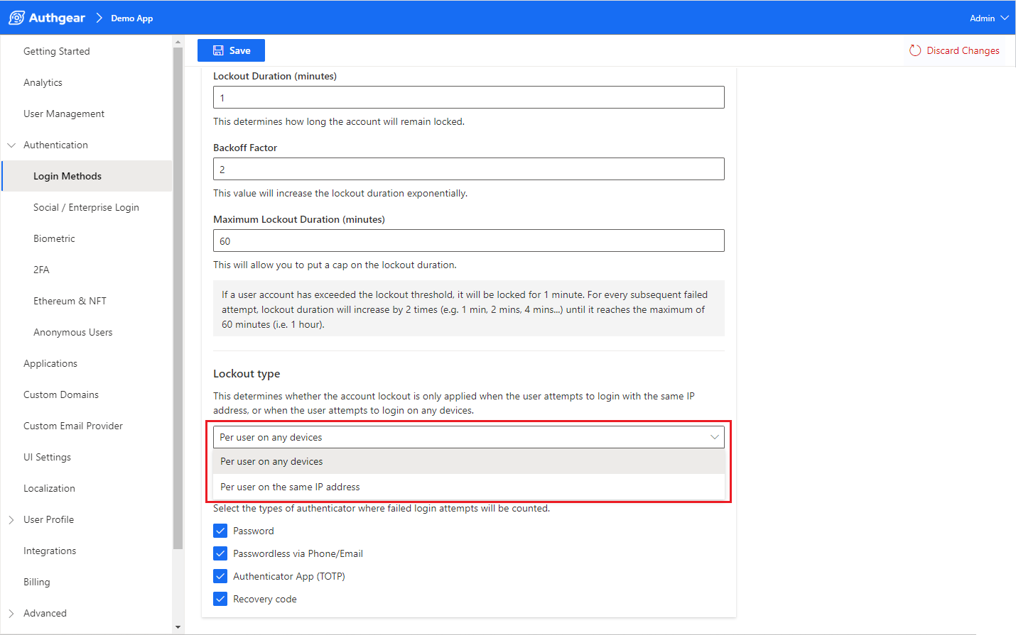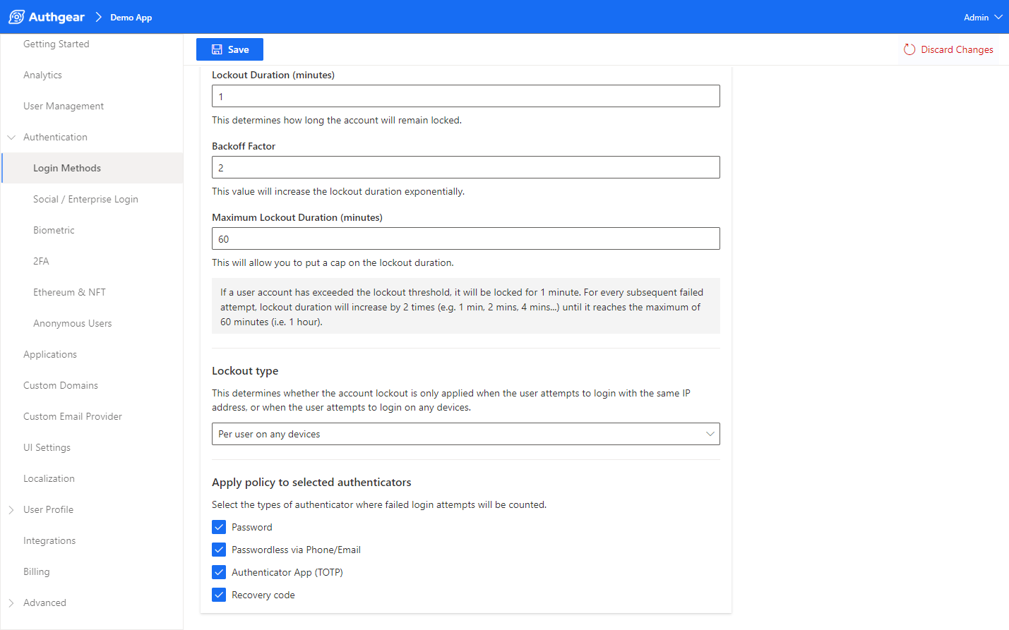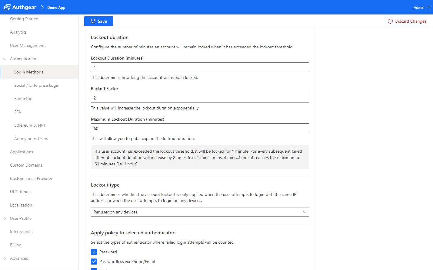 Lastly, the last “Apply policy to selected authenticators” feature allows you to select the types of authentication method where failed login attempts will be counted.